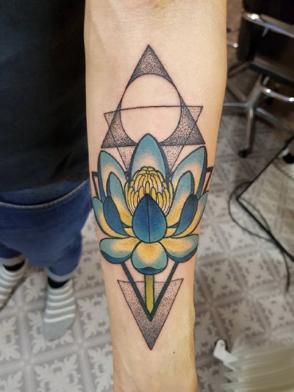 手臂纹身素材 男生手臂上三角形和花朵纹身图片