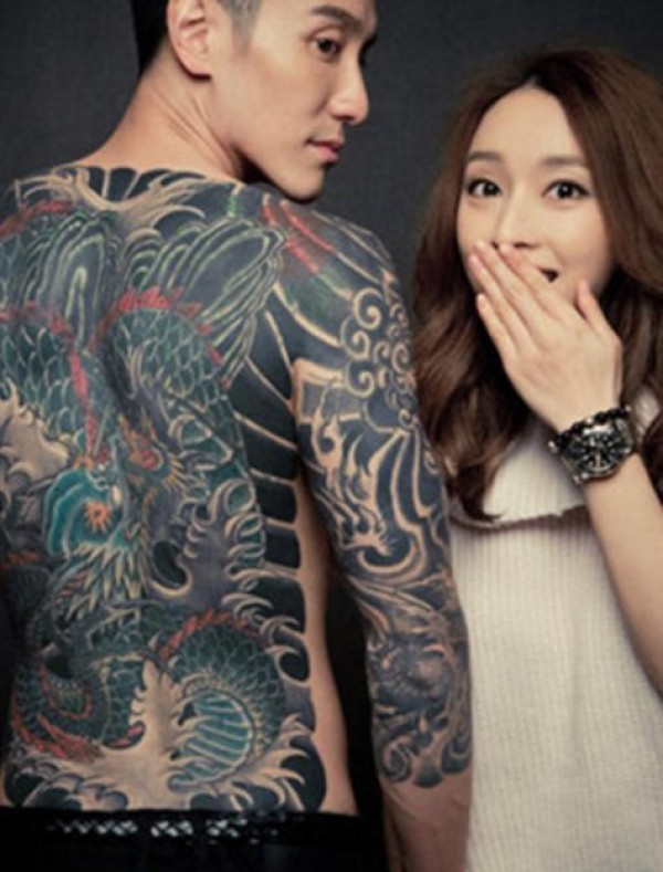 中国纹身明星 王阳明满背彩绘的龙纹身图片