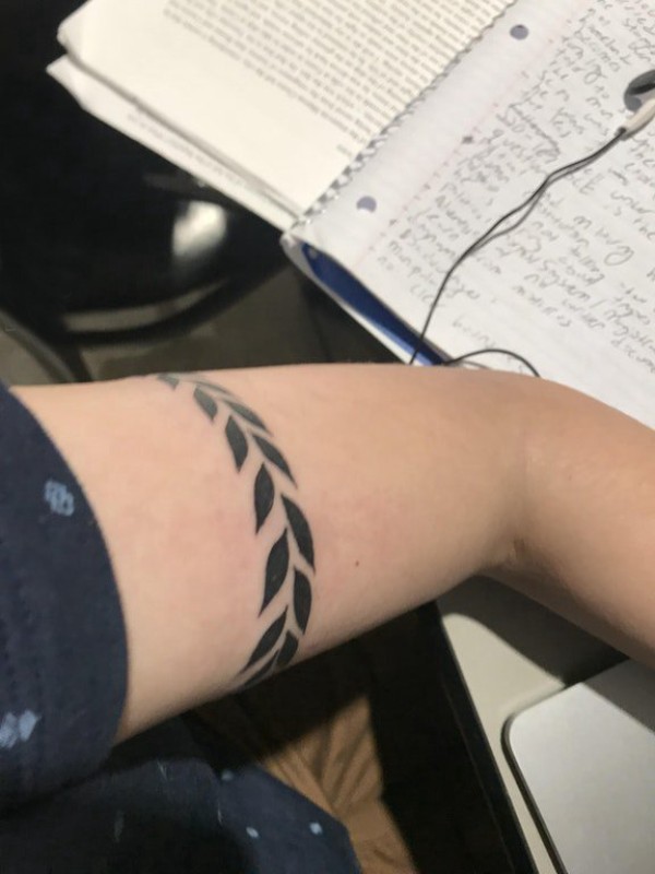 植物纹身 女生大臂上黑色的植物臂环纹身图片