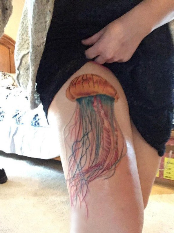 水母纹身图案 女生大腿上彩色的水母纹身图片