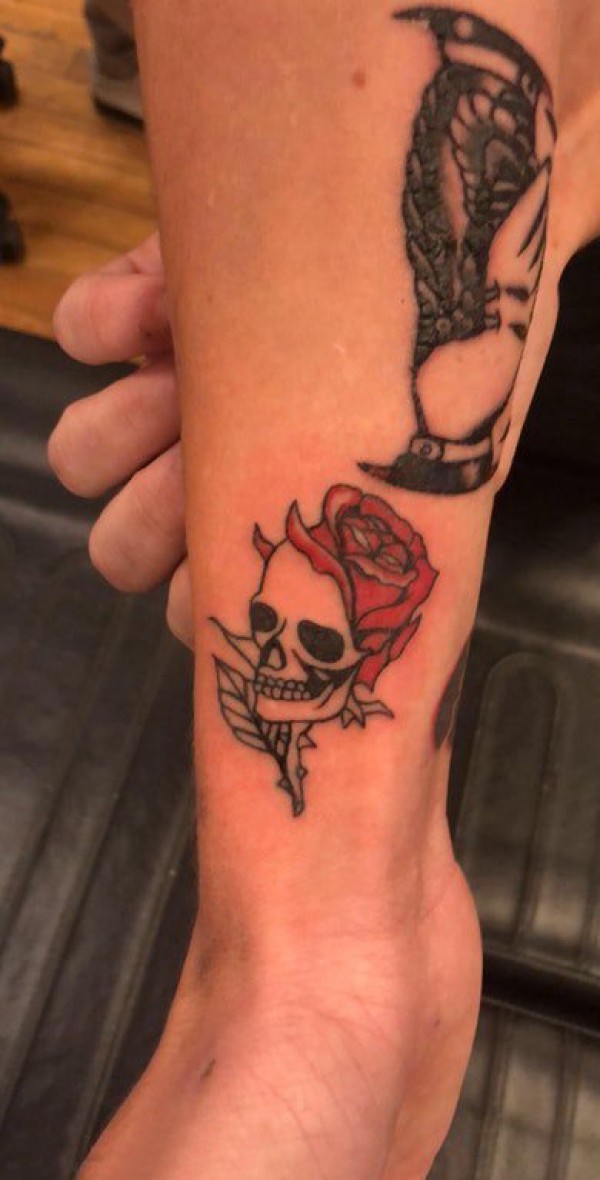 纹身小巧 男生小腿上玫瑰和骷髅纹身图片