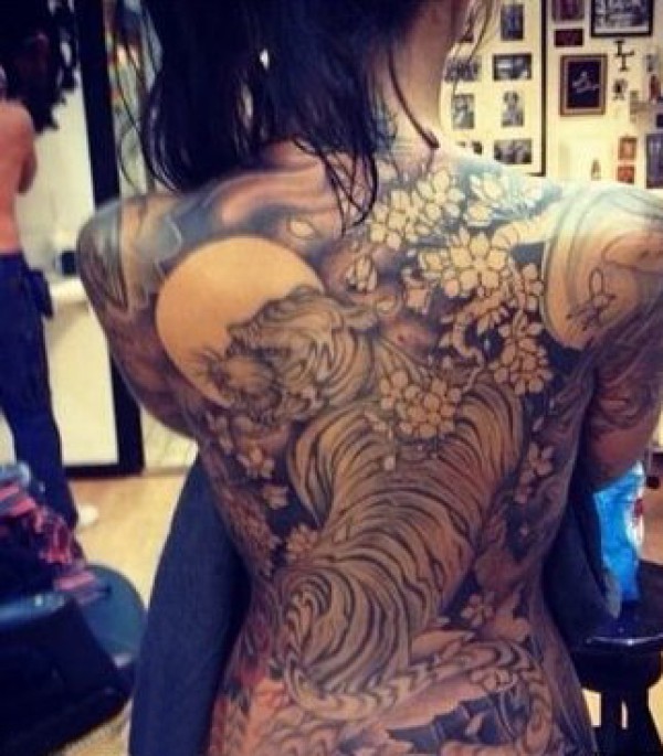 纹身师电影 人物满背彩绘的老虎纹身图片