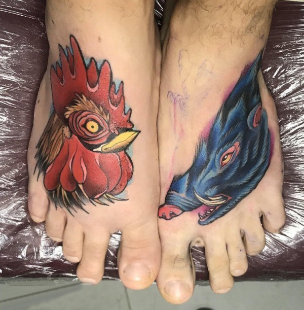 脚背纹身 男生脚背上公鸡和野猪纹身图片