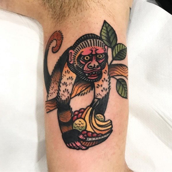 大臂纹身图 男生大臂上植物和猴子纹身图片