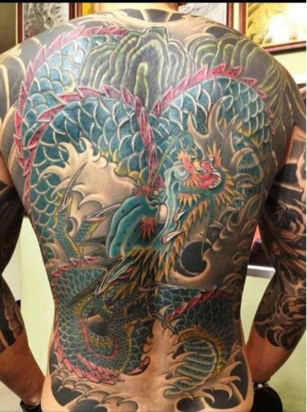 中国纹身明星 王明阳背上彩绘的龙纹身图片
