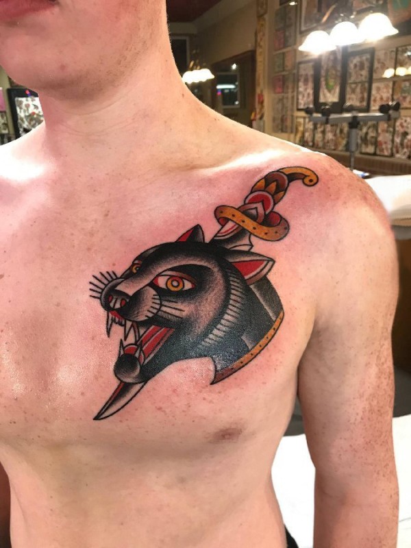 豹子头纹身 男生胸上豹子和匕首纹身图片