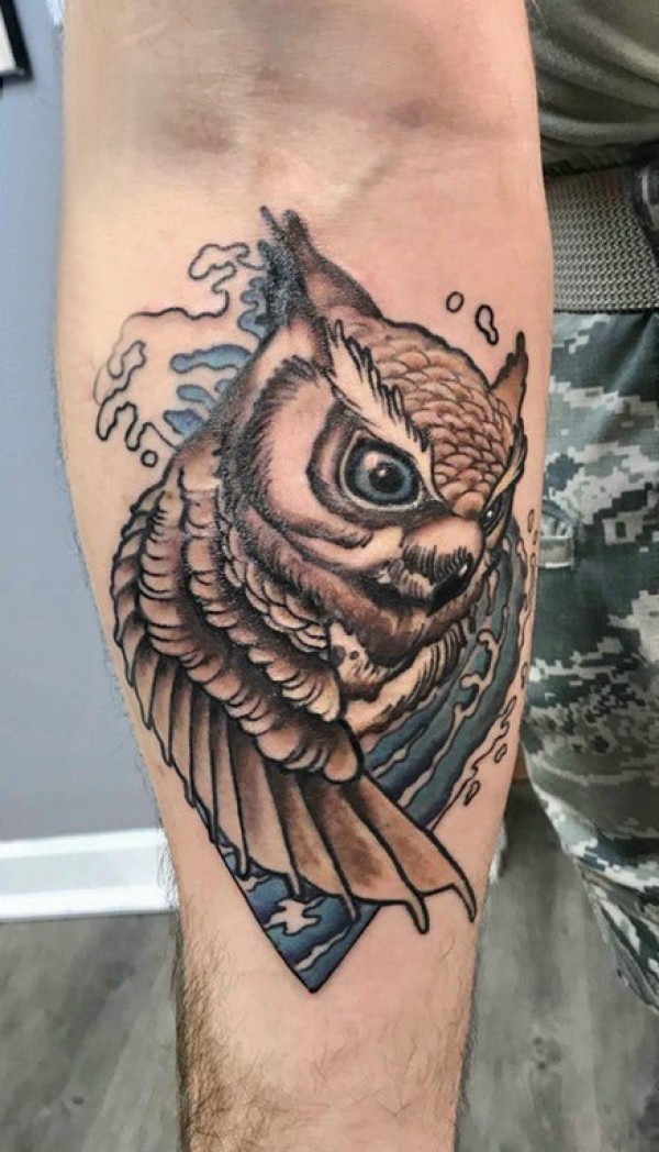 纹身猫头鹰 男生手臂上浪花和猫头鹰纹身图片