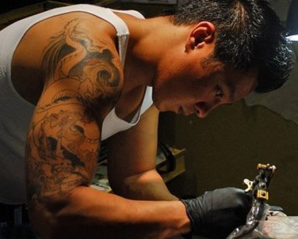 纹身师电影 人物手臂上黑灰色的龙纹身图片