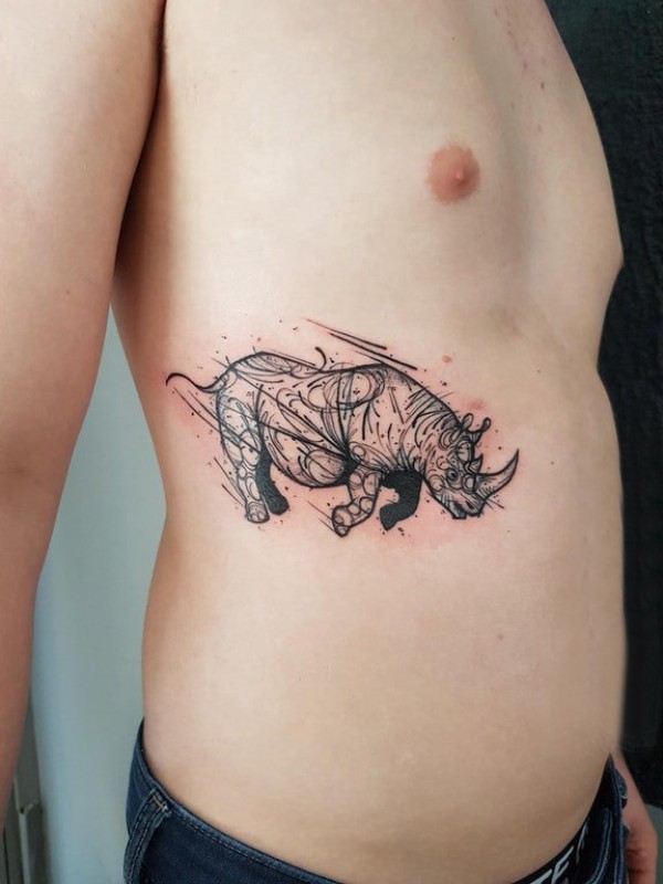 纹身侧腰男 男生侧腰上黑色的犀牛纹身图片