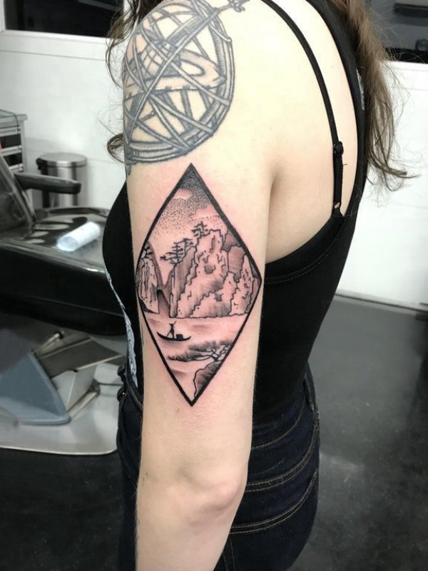 风景纹身 女生手臂上黑灰色的风景纹身图片