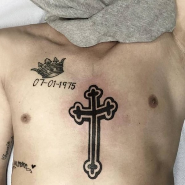 男子右侧肋上的弯月挂着吊坠十字架纹身图片