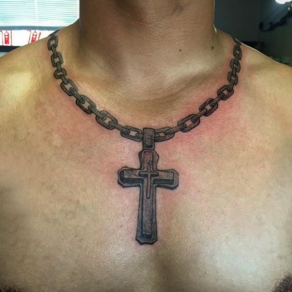 男子右侧肋上的弯月挂着吊坠十字架纹身图片