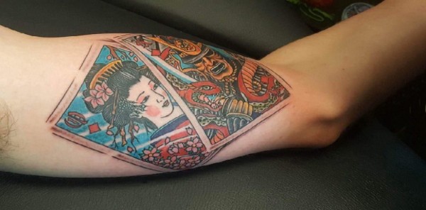 大臂纹身图 男生大臂上几何和艺妓纹身图片