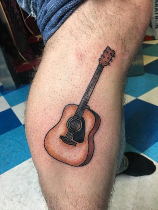 电吉他纹身 男生小腿上彩色的吉他纹身图片