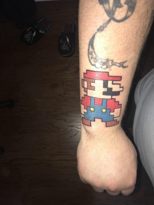 超级玛丽纹身 男生手腕上彩色的超级玛丽游戏纹身图片