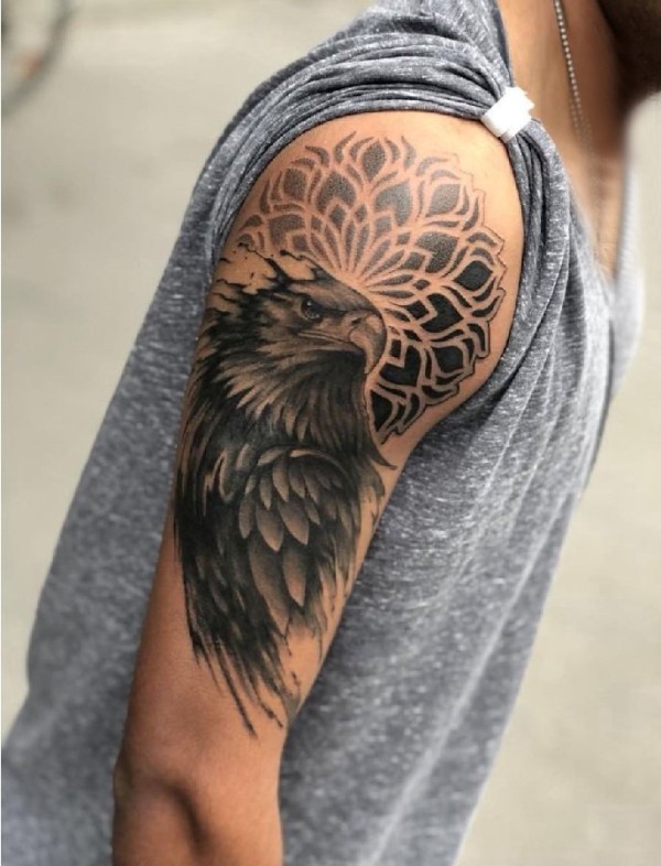 雄鹰鹰纹身 男生手臂上黑灰色的雄鹰鹰纹身图片