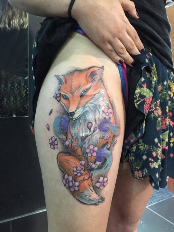小动物纹身 女生大腿上花朵和狐狸纹身图片