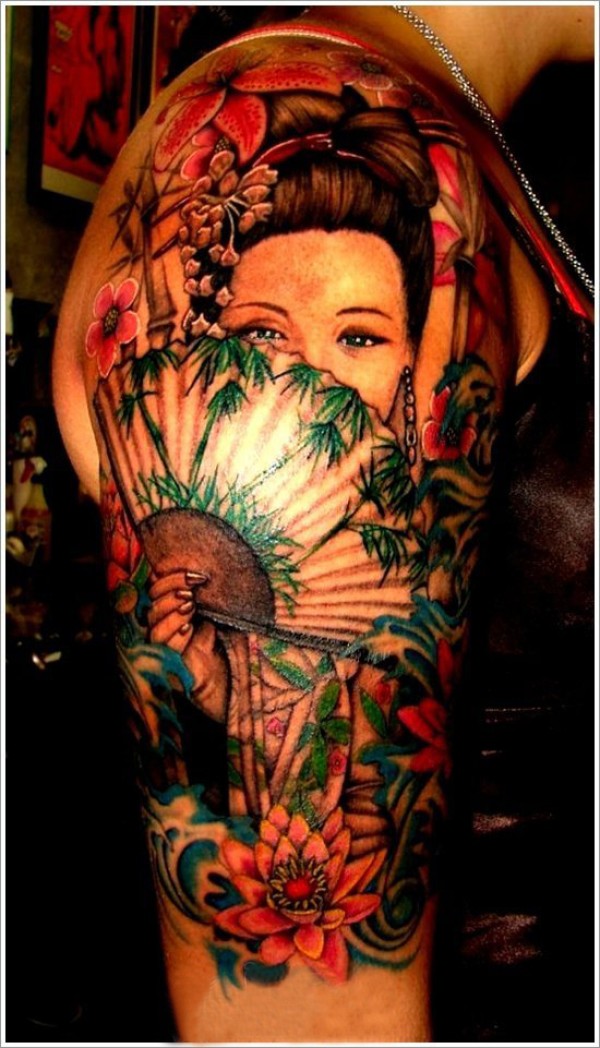 双大臂纹身 男生大臂上遮面的艺妓纹身图片