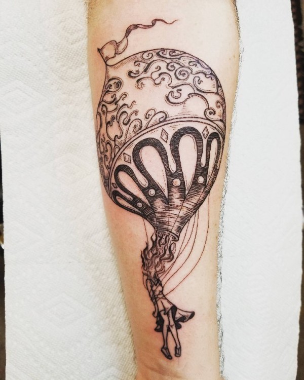 手臂纹身图片 男生手臂上人物和热气球纹身图片