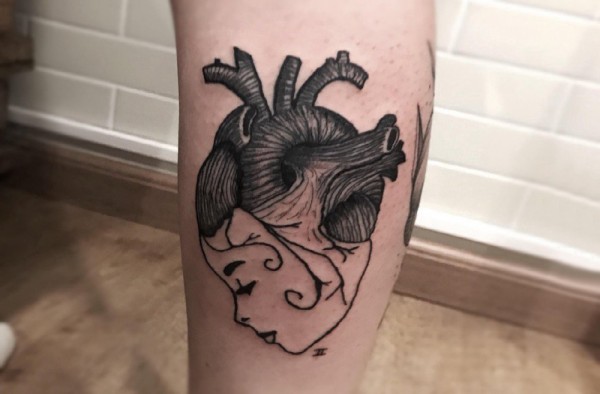 欧美小腿纹身 女生小腿上心脏和人物拼接纹身图片