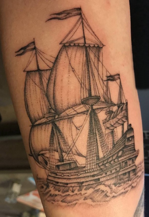 大腿纹身男 男生大腿上航行的帆船纹身图片