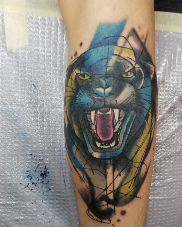 欧美小腿纹身 男生小腿上彩色的豹子纹身图片