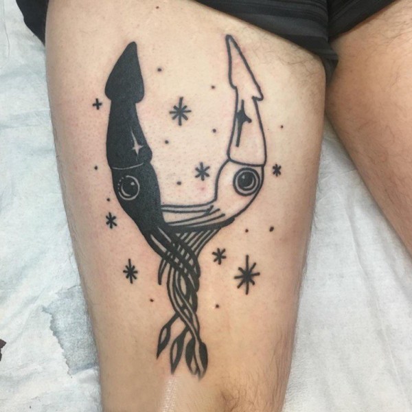 大腿纹身男 男生大腿上黑色的鱿鱼纹身图片