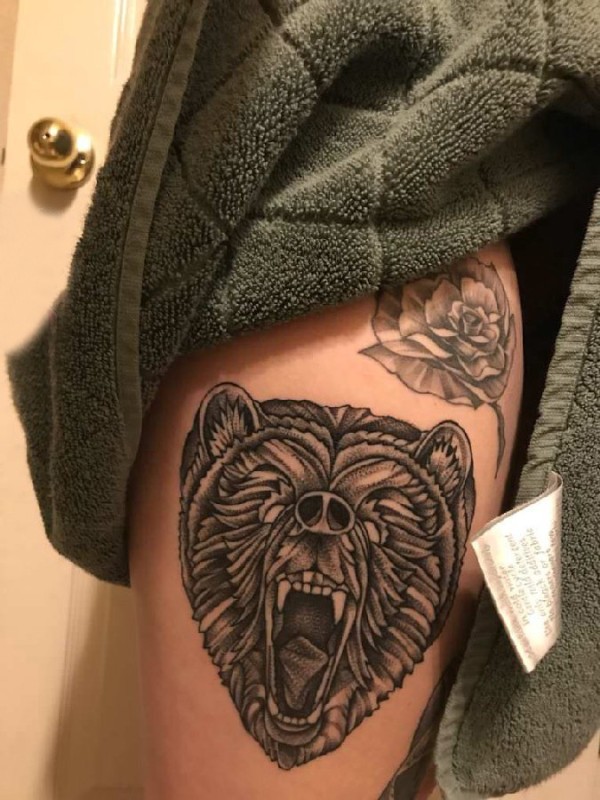 大腿纹身传统 女生大腿上怒吼的熊纹身图片