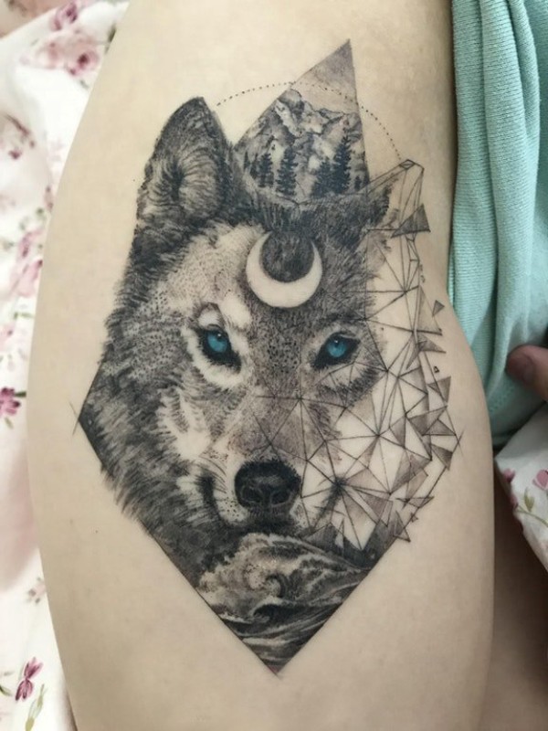 几何元素纹身 女生小腿上狼头和山水风景纹身图片