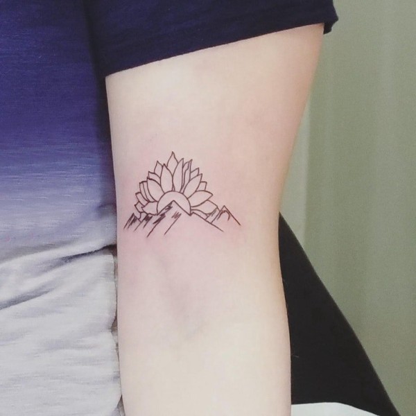 极简线条纹身 女生手臂上莲花和山脉纹身图片
