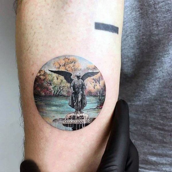 纹身风景 男生手臂上圆形和雕塑纹身图片