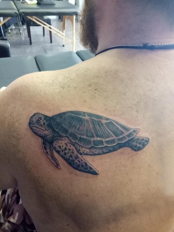 纹身后背男 男生后背上黑色的海龟纹身图片