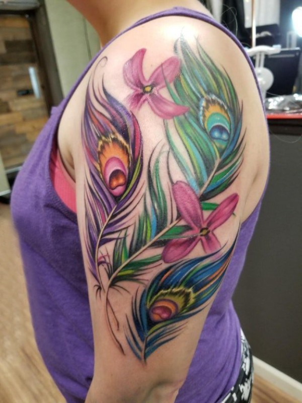 大臂纹身图 女生大臂上花朵和孔雀羽毛纹身图片