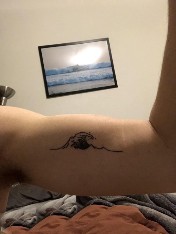 极简线条纹身 男生大臂上黑色的海浪纹身图片
