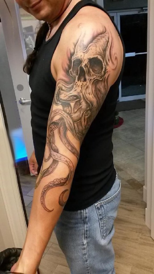 手臂纹身素材 男生手臂上黑色的骷髅章鱼纹身图片