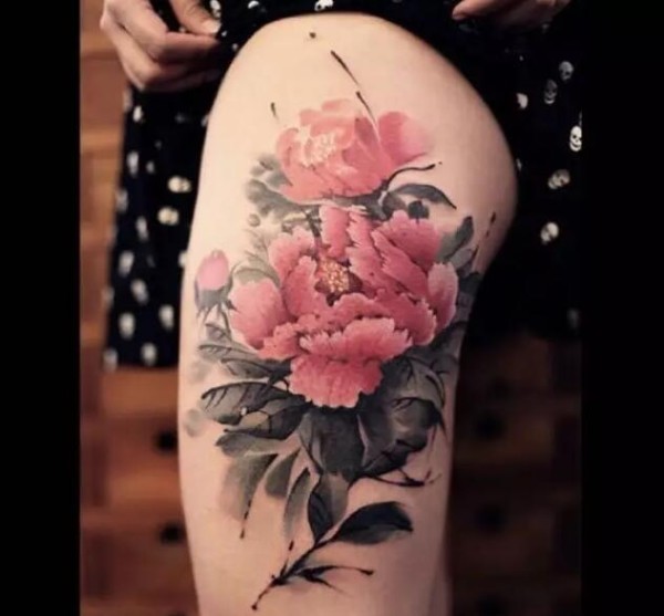 古典精致的彩色花臂牡丹花艺妓海浪纹身图案