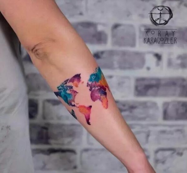 彩色渐变纹身 男生手臂上英文和地图纹身图片