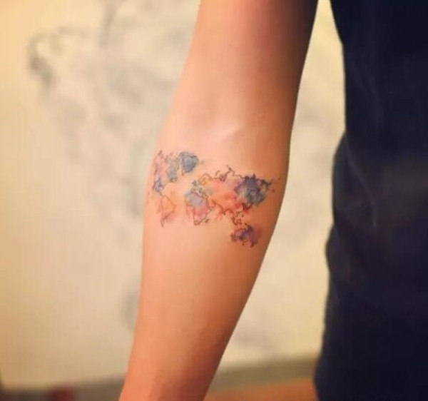彩色渐变纹身 男生手臂上英文和地图纹身图片