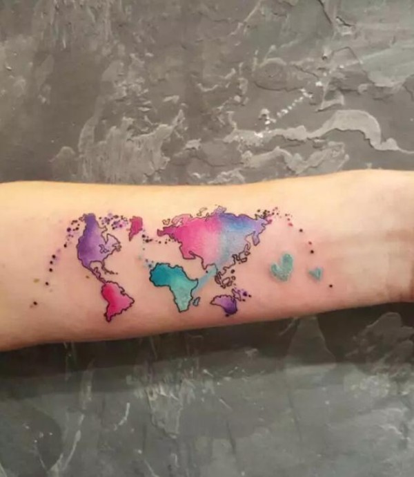 彩色渐变纹身 男生手臂上英文和地图纹身图片