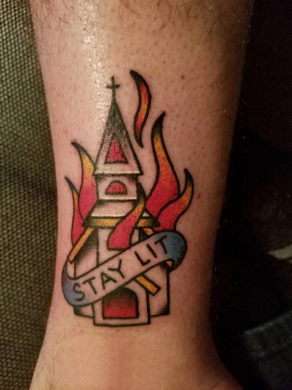 建筑物纹身 男生小腿上火焰和建筑物纹身图片