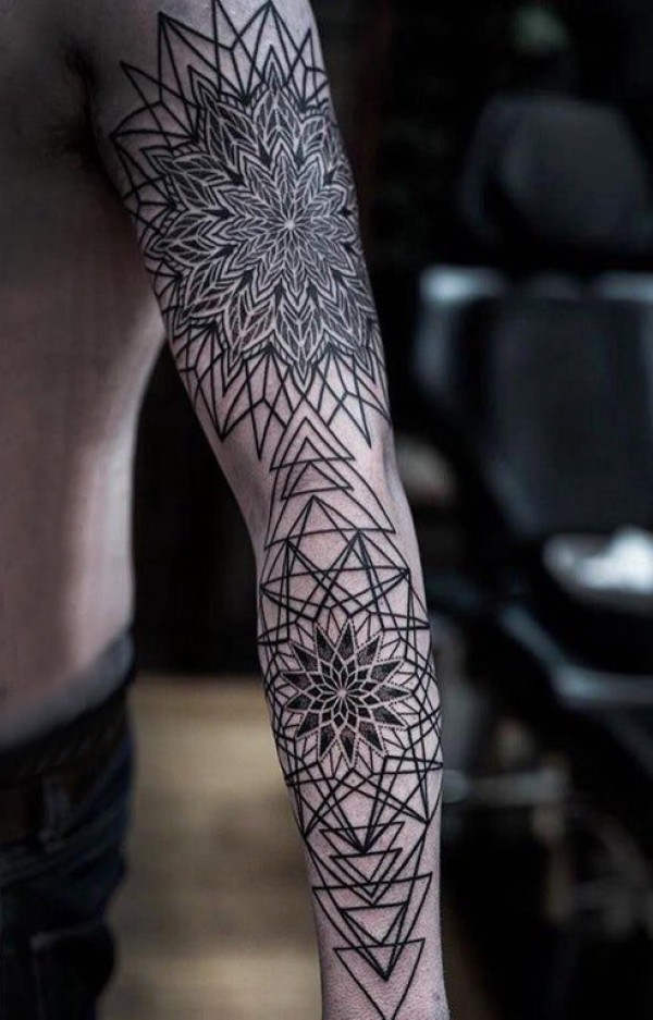 几何元素纹身 男生手臂上黑色的几何梵花纹身图片