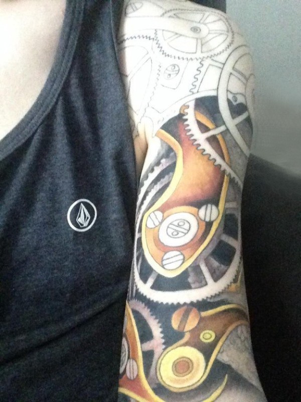 齿轮纹身 男生手臂上彩色的齿轮纹身图片
