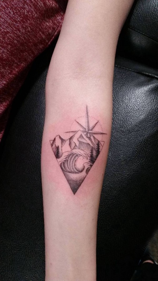 手臂山水纹身 女生手臂上指南针和山水纹身图片