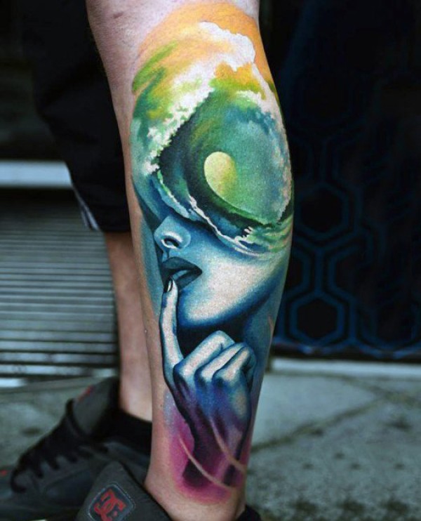 欧美小腿纹身 男生小腿上彩色的女生人物纹身图片