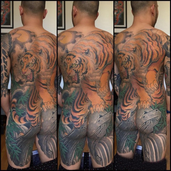 后背纹身男 男生后背上彩色的老虎纹身图片