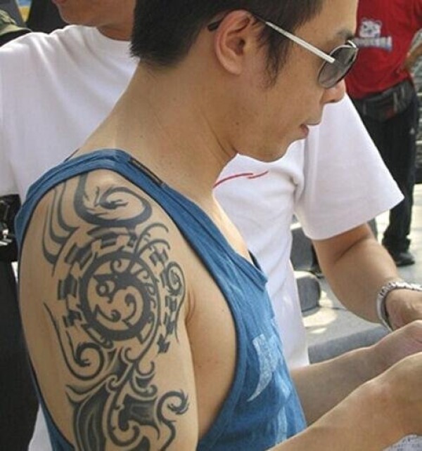 中国纹身明星 黄贯中手臂上黑色的部落图腾纹身图片