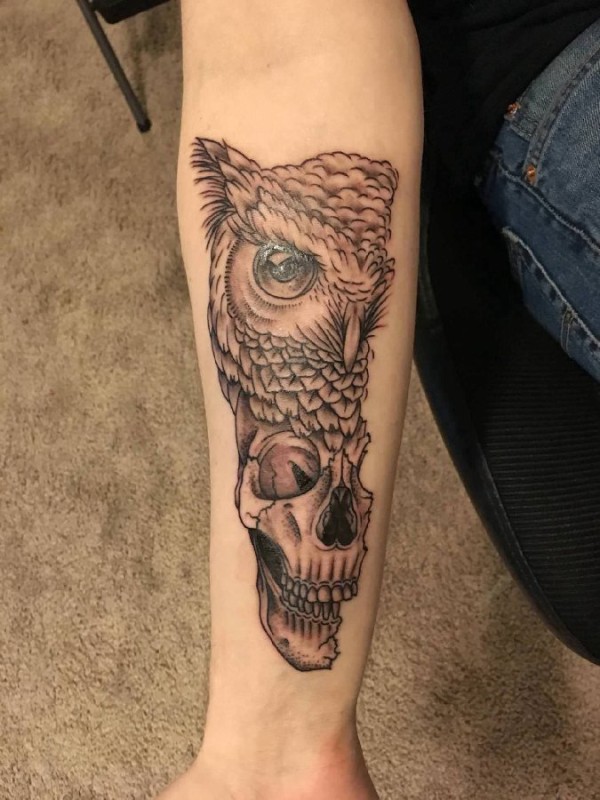 手臂纹身图片 女生手臂上猫头鹰和骷髅纹身图片