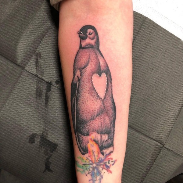 手臂纹身素材 女生手臂上指南针和企鹅纹身图片