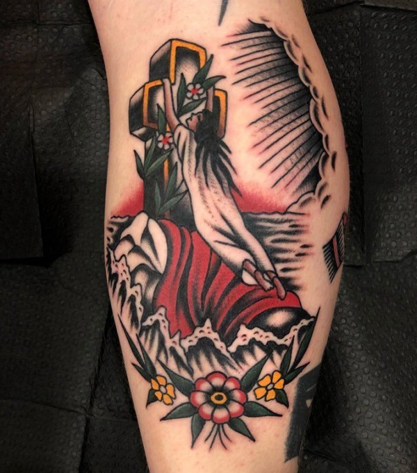 十字架纹身图 女生小腿上植物和十字架纹身图片
