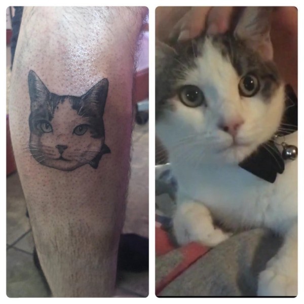 超写实纹身 男生小腿上黑色的猫咪纹身图片
